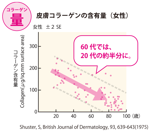 コラーゲンは年齢と共に減少し60代では20代の約半分になるというデータも…。
